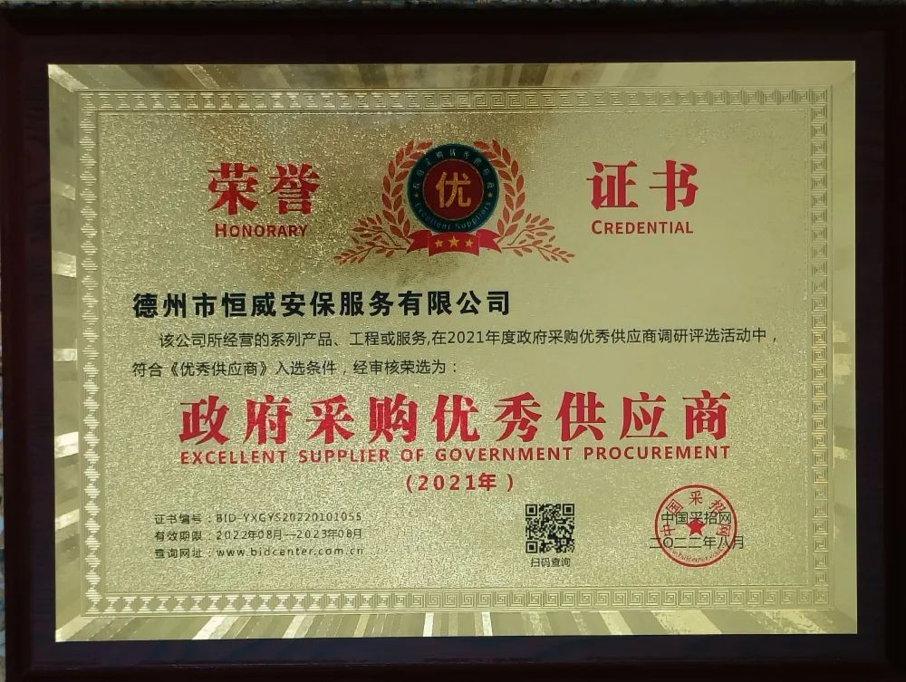 熱烈祝賀!德州市恒威安保服務(wù)有限公司榮獲“,采購(gòu)優(yōu)良供應(yīng)商”榮譽(yù)稱號(hào)