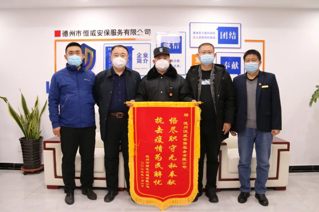 1月13日,德州市靜態交通有限公司呂強主任一行三人到訪德州市恒威安保有限公司,將寫有“恪盡職守無私奉獻 抗擊疫情為民解憂”錦旗交予恒威安保手中,公司副總經理張玉濤、張有利,七公司大隊長高榮海參與接待。