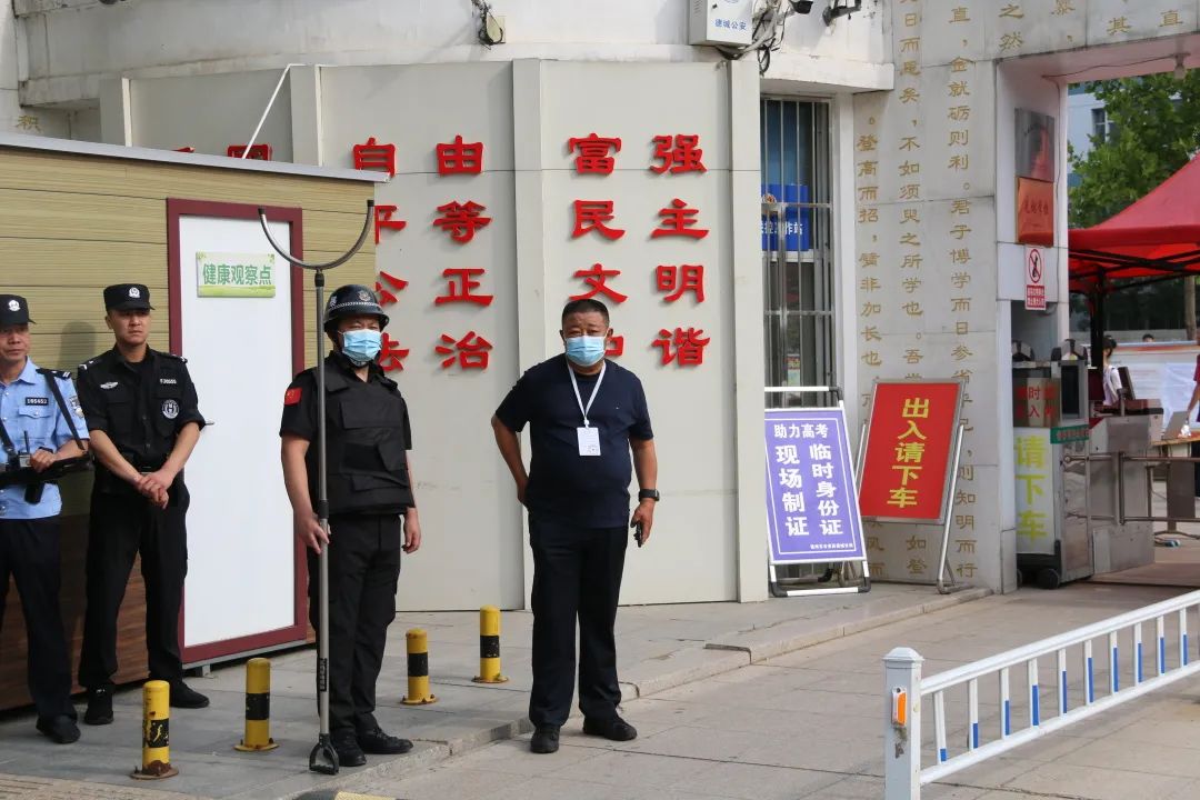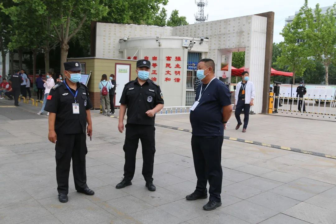 7:00,距離開考還有2個小時,副總經理董光鵬親臨一中、實驗高中考點,為保安隊員鼓干勁、提精神并對考點安保工作再動員、再強調、再部署,中隊長賈義軍、侯佃榮帶領保安隊員枕戈待旦,嚴陣以待,迅速進入工作狀態,靜候高考學子入場。