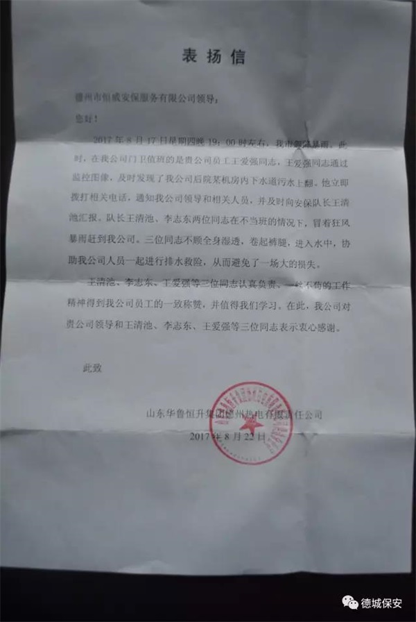 經了解,2017年8月17日晚19時許,我市突降暴雨。人防二大隊六中隊派駐山東華魯恒升集團德州熱電有限責任公司保安隊員王愛強在監控視頻畫面中,及時發現客戶單位后院機房內下水道污水上翻,且發電機組正在運行,情況危急。他立即撥打了相關電話,通知客戶單位領導和相關人員切斷電源,并通知已下班的保安班長王清池和李志東。王清池、李志東兩名同志正在家中休息,聽到情況后,冒著大雨趕到單位,和王愛強一起卷起褲腿、進入齊腰深的水中,協助客戶單位搶險人員一起排水搶險,成功避免一場重大損失。恒升德州熱電領導得知此事后,高度重視,要求相關領導親自到恒威公司感謝相關搶險人員,也為保安隊員認真負責、愛崗敬業的作風表示欽佩。同時對恒威公司能培養作風過硬的保安隊員和提供的優良、好的效率率的安保服務表示認同和贊揚。