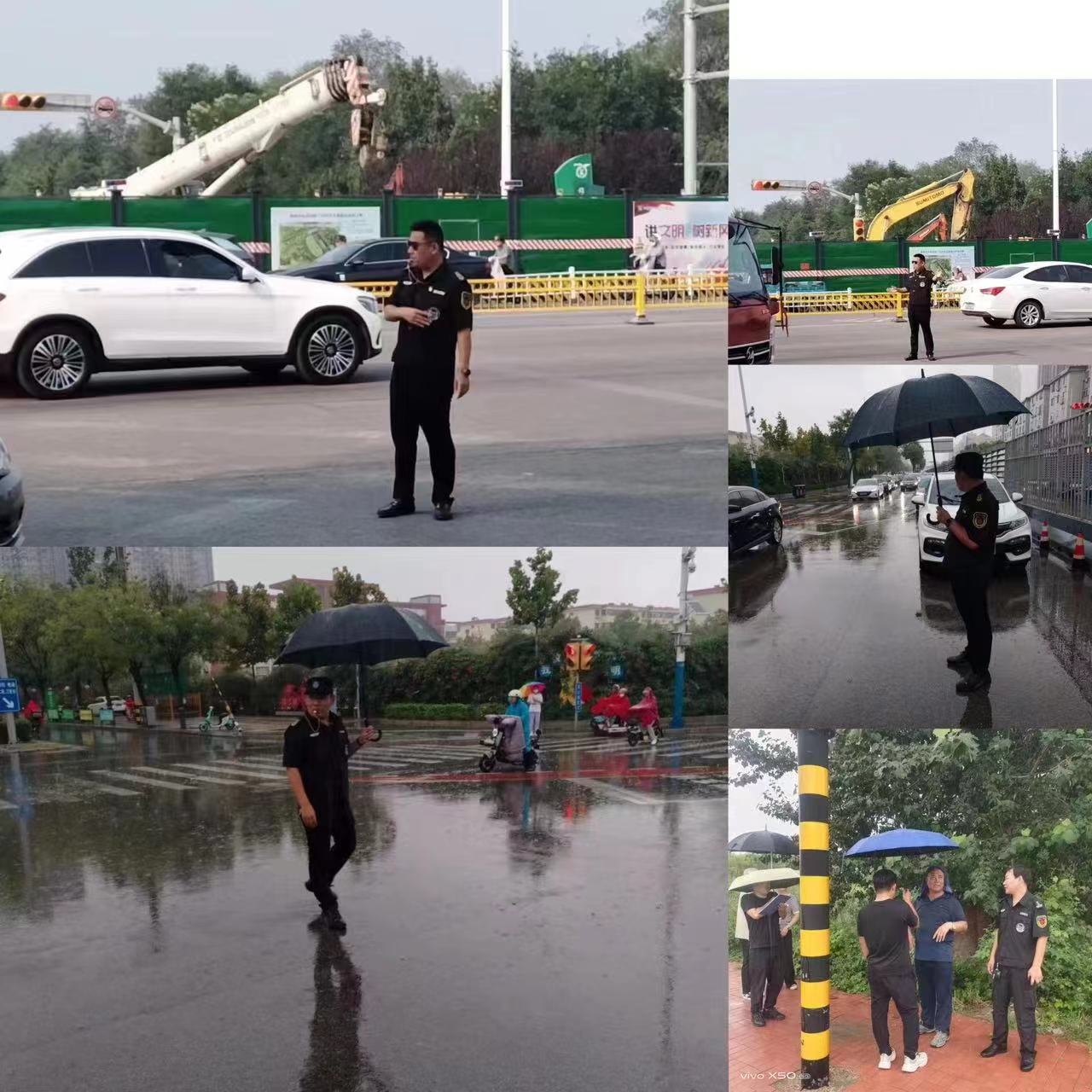 一公司承接多處道路交通協管勤務且點位較為分散,7月28日下午,副總經理王洪林深入勤務現場,與交警部門積極對接,對執勤點位安全隱患進行排查,并要求各分管隊長務必高度重視,對存在安全隱患的警示牌,迅速對接施工方對其進行加固,以免發生事故,同時叮囑隊員們在做好自身防護的前提下,嚴格落實好各項防汛舉措,確保道路安全暢通。由于城區突降大雨,加之正值下班高峰時段,車流量不斷加大,車輛通行緩慢,王洪林也加入交通疏導隊伍,與隊員們一起冒雨疏導過往車輛,緩解交通通行壓力。