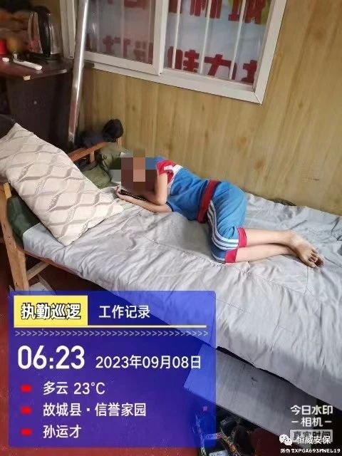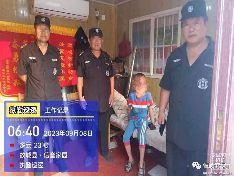 事情發生在2023年9月7日晚23點16分,恒威安保駐信譽家園執勤班組在巡邏過程中,發現一名7歲的小孩獨自在小區內行走,便上前詢問,得知孩子找不到回家的路也記不得家長的電話,巡邏隊員便把孩子帶到值班門崗,陪伴在孩子身旁,不停地安慰孩子,同時在小區業主群內發布尋找孩子家屬的信息,一直到凌晨1點仍然沒聯系到孩子的家長,于是保安隊員將自己臨時休息的單人床讓給孩子休息,隊員們則輪流值班陪伴在他身旁。