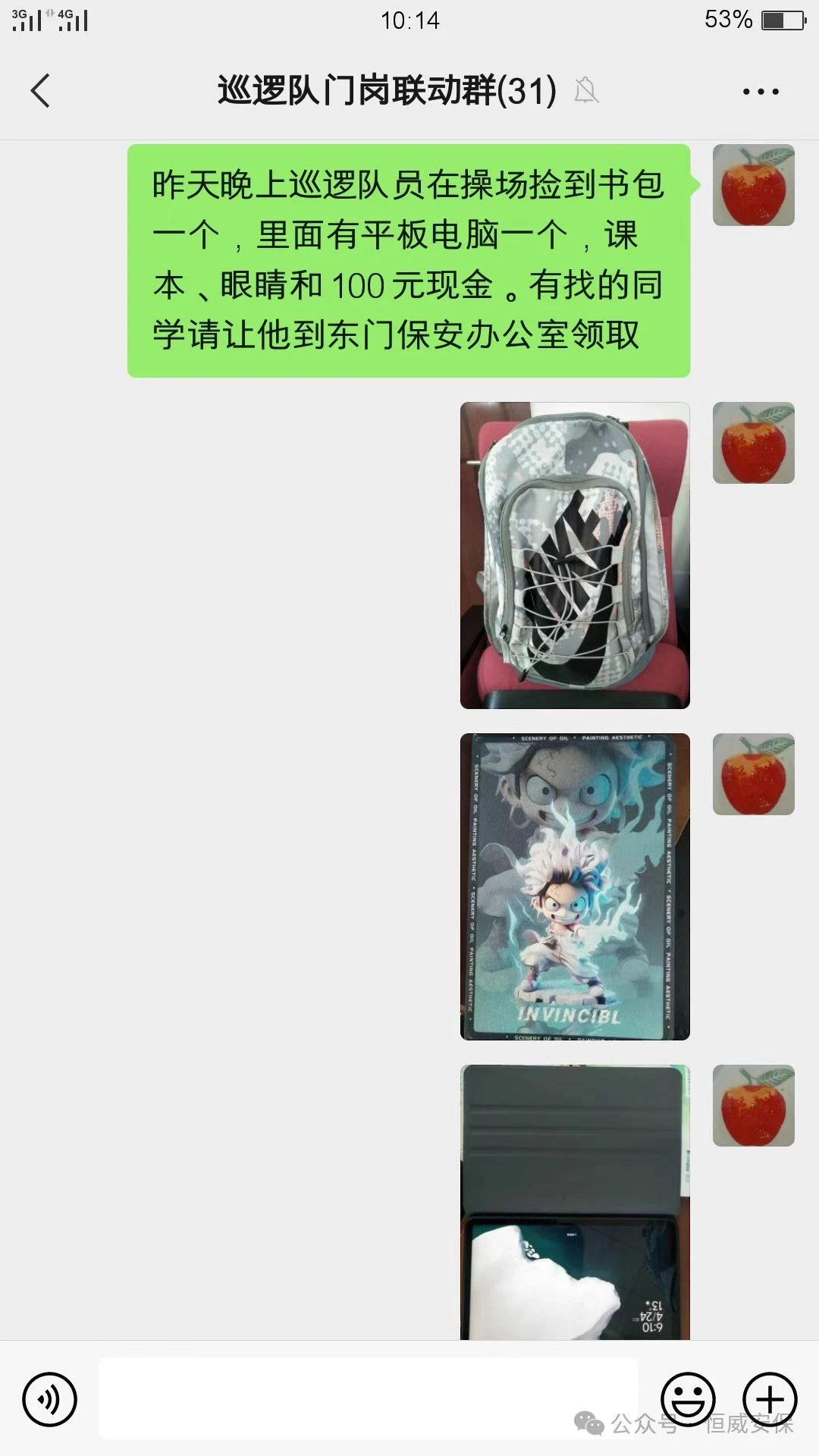 4月24日晚20時(shí)左右,恒威安保駐德州學(xué)院執(zhí)勤班隊(duì)員王順元,在學(xué)校操場巡邏時(shí),發(fā)現(xiàn)操場邊遺落一背包。詢問周邊人員,均不是失主。經(jīng)查看背包里面有一個(gè)平板電腦、眼鏡等物品,無法與失主直接取得聯(lián)系,隨即將背包帶回值班室,并在微信工作群中發(fā)布失物招領(lǐng)信息。第二天上午,失主陳同學(xué)得知消息后來到值班室認(rèn)領(lǐng)背包,值班人員經(jīng)核實(shí)確認(rèn)后將背包歸還陳同學(xué)。陳同學(xué)激動(dòng)地表示,“太感謝王師傅了,昨天發(fā)現(xiàn)背包丟了,擔(dān)心了一晚上,今早晨得知保安師傅撿到了背包,一大早就來到值班室領(lǐng)取,包里物品完好無損,真是太感動(dòng)了!”