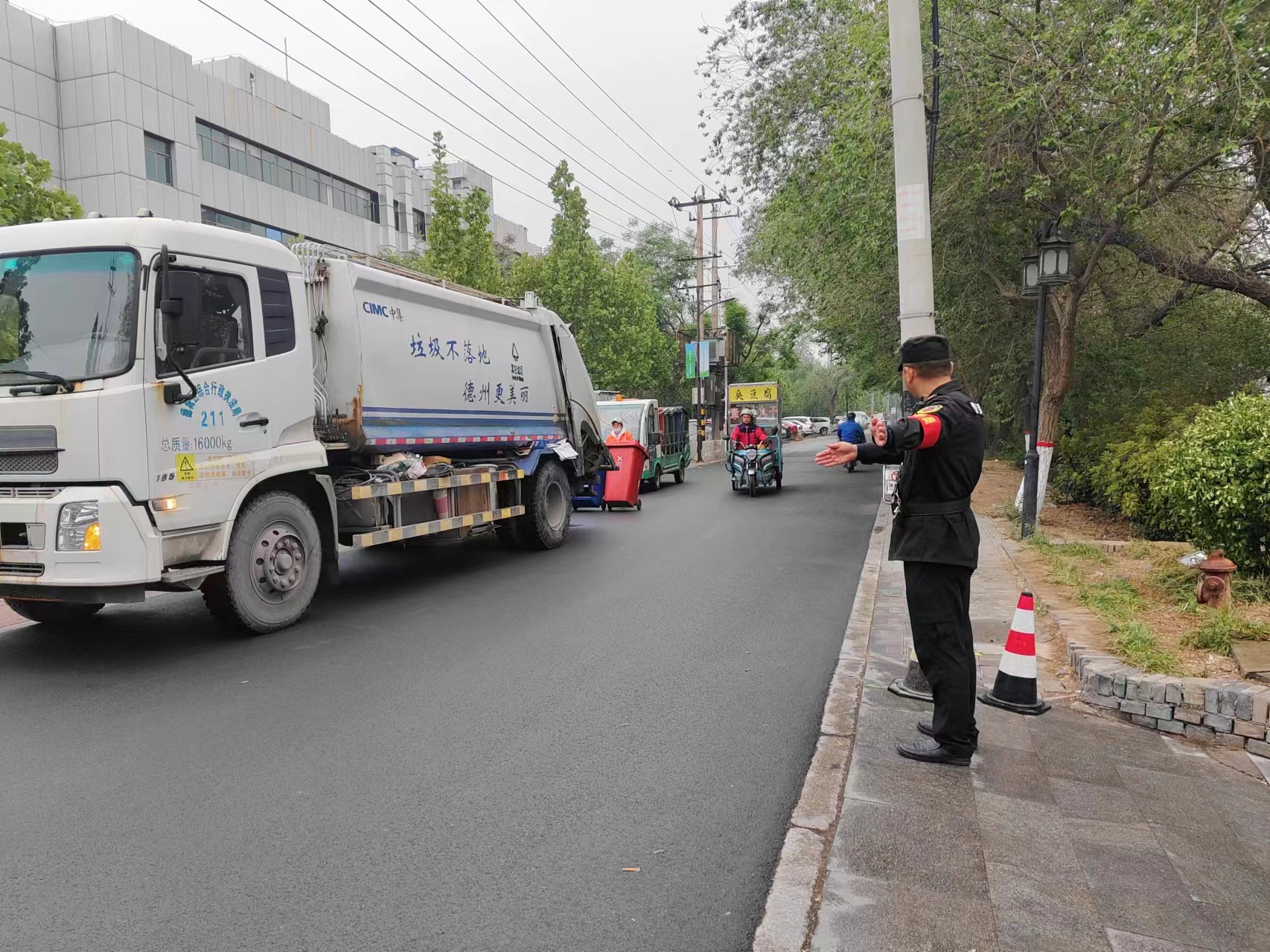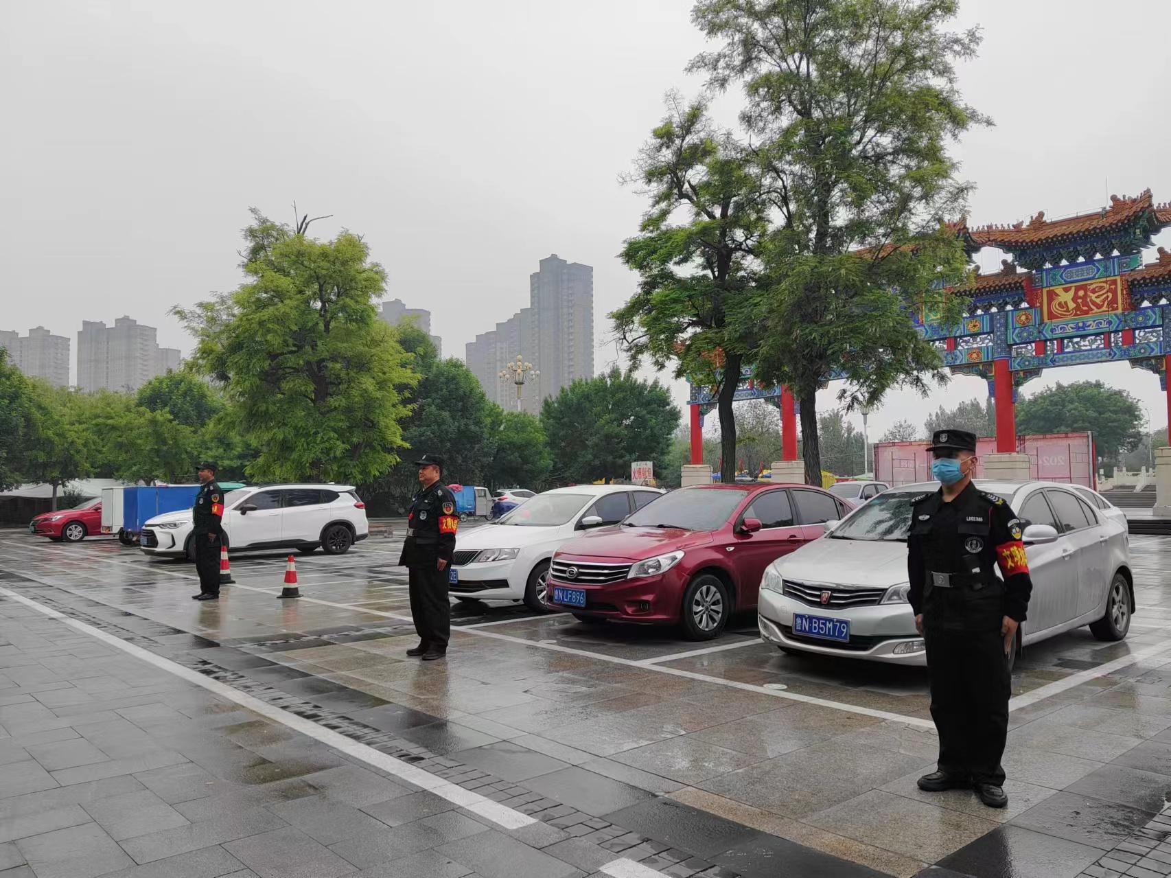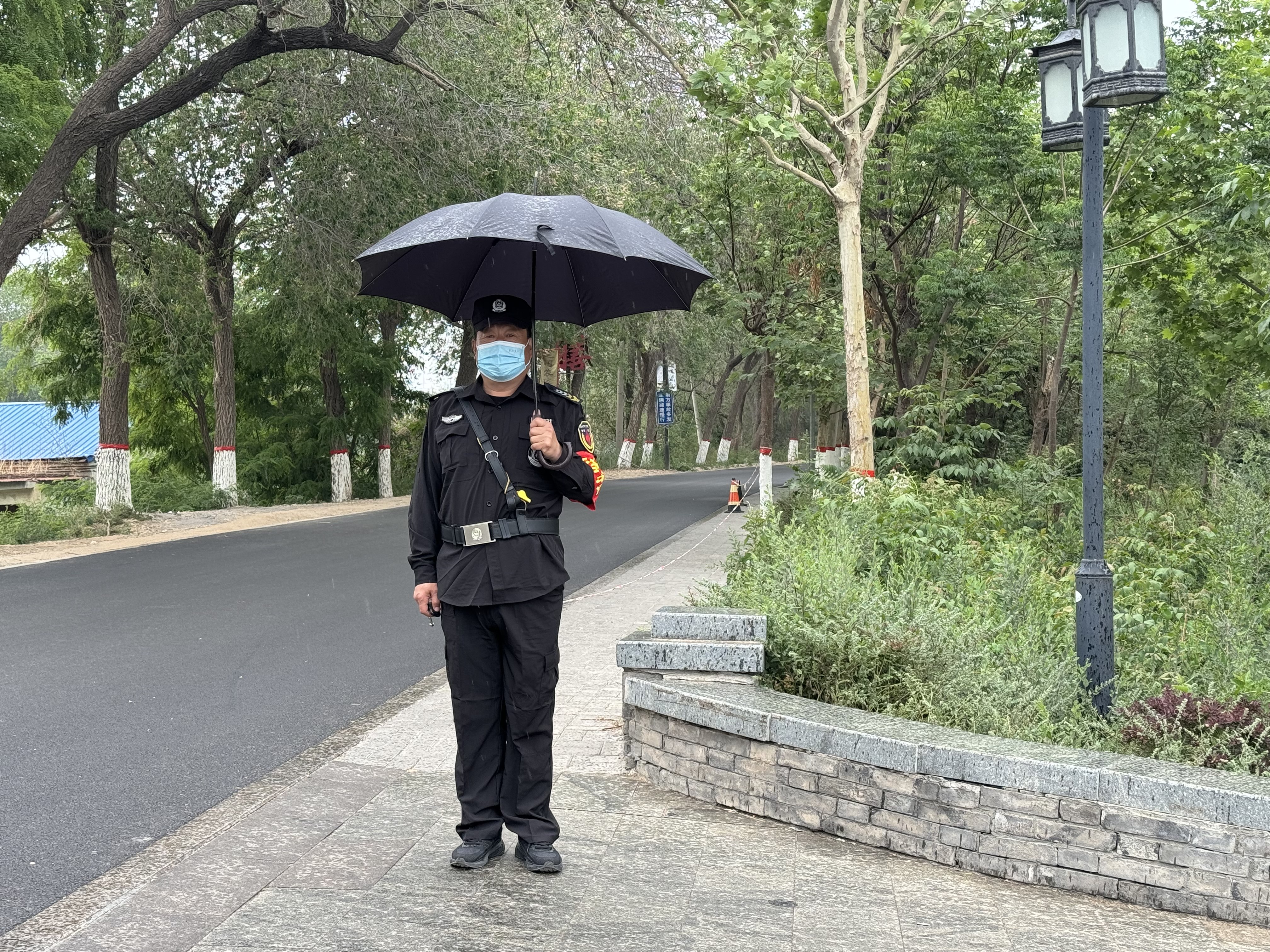 勤務第一天上午下起了小雨,但人流量并沒有因天氣原因減少,很多外地游客慕名到運河古街拍照游玩,為了維持好車場和景區的秩序,隊員們冒雨堅守崗位,確保車輛安全出入,景區秩序井然有序。