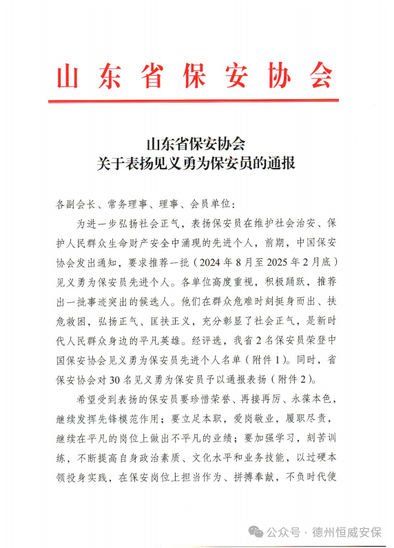 【喜報(bào)】公司3名見(jiàn)義勇為保安員獲山東省保安協(xié)會(huì)通報(bào)表?yè)P(yáng)