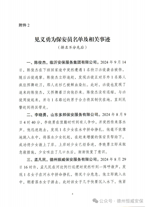 近日,山東省保安協(xié)會(huì)發(fā)布《關(guān)于表?yè)P(yáng)見(jiàn)義勇為保安員的通報(bào)》,對(duì)30名見(jiàn)義勇為保安員先進(jìn)個(gè)人進(jìn)行通報(bào)表?yè)P(yáng),公司于林成等3名見(jiàn)義勇為保安員獲表?yè)P(yáng)!