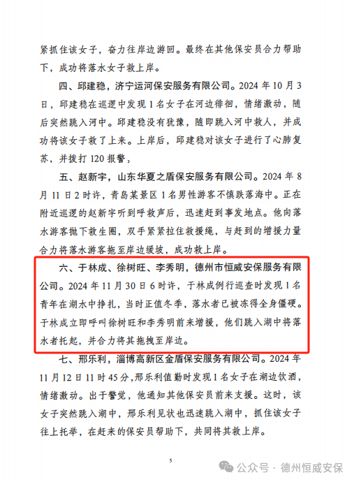 德州市恒威安保服務(wù)有限公司保安員于林成、徐樹(shù)旺、李秀明同志,在2024年11月30日清晨6時(shí)許,于德城區(qū)新湖景區(qū)例行巡查時(shí),展現(xiàn)出英勇無(wú)畏、見(jiàn)義勇為的精神,成功救助一名落水青年。這一事跡充分體現(xiàn)了新時(shí)代保安員的責(zé)任感和使命感,弘揚(yáng)了社會(huì)正氣。