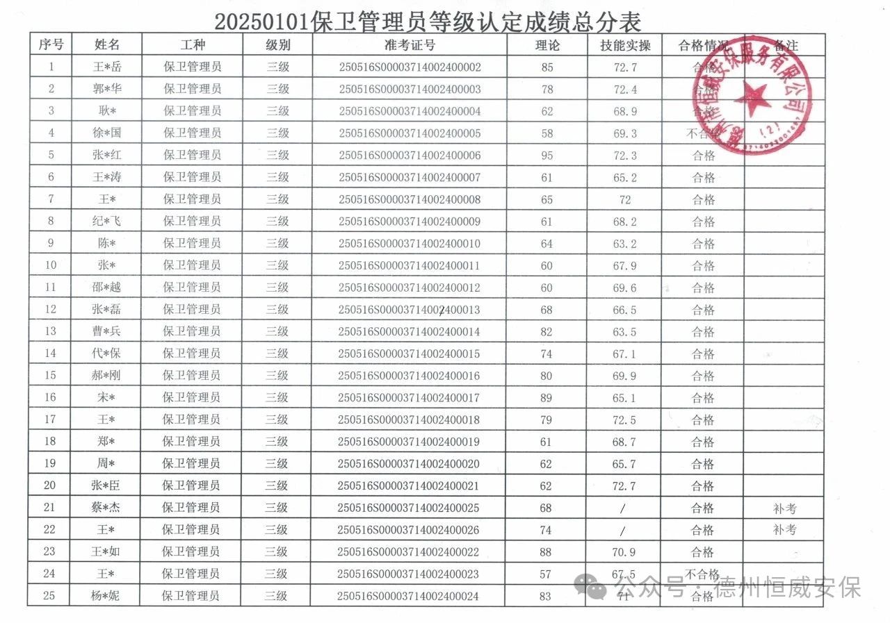 德州市第二批保衛(wèi)管理員(三級)職業(yè)技能等級認(rèn)定成績公示: