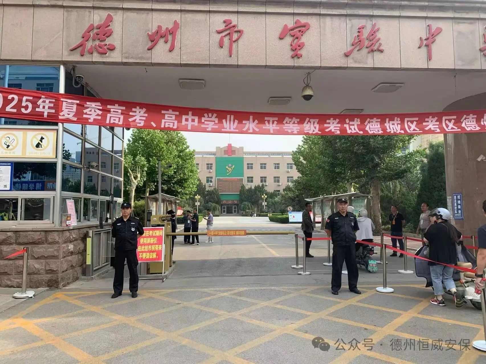 隨著2025年高考落下帷幕,德州市恒威安保服務有限公司以高度的政治責任感和使命感,全力以赴、周密部署,圓滿完成了德城區3個考點的安保任務,為莘莘學子營造了安全、寧靜、有序的考試環境,贏得了教育主管部門、考點學校及廣大考生、家長的高度贊譽。