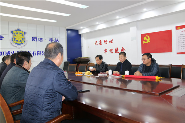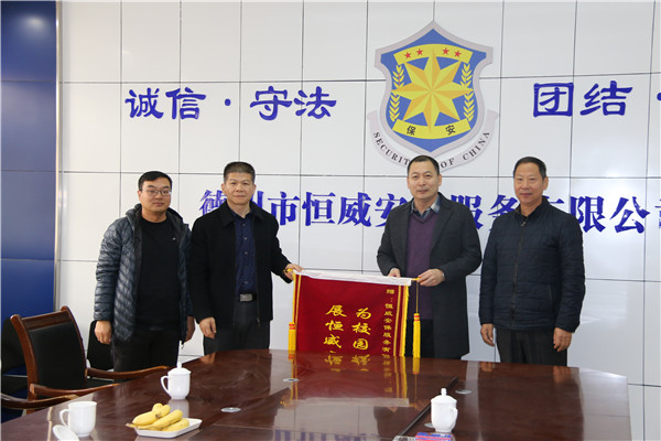 2018年11月30日上午, 德州學院保衛處處長王榮朝、副處長李巖、治安科長王鳳丹來我公司調研慰問并贈送繡有“為校園保駕護航、展恒威安保風采”錦旗一面。