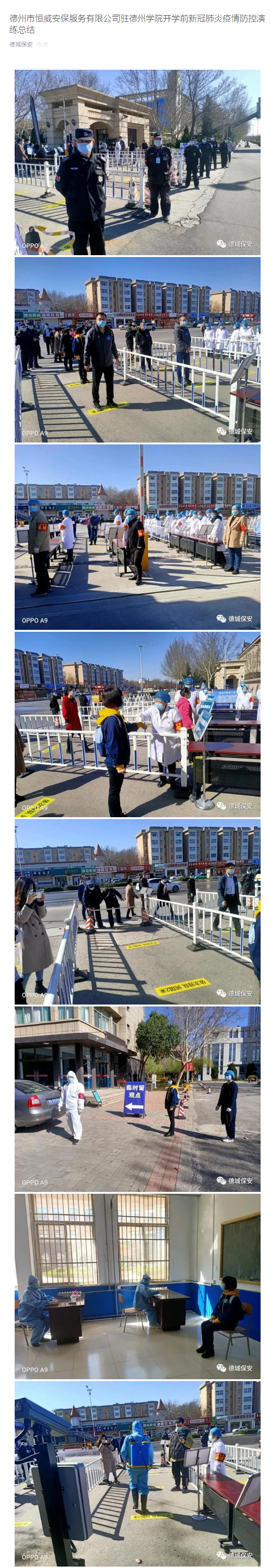 為進一步規范校園新冠肺炎疫情防控工作,提升學校應對突發疫情的應急指揮能力和組織協調能力,切實保障師生的健康安全,根據相關文件要求,3月19日上午,德州市恒威安保服務有限公司駐德州學院安保部門與校方組織舉行新冠肺炎防控應急模擬演練。具體情況如下: