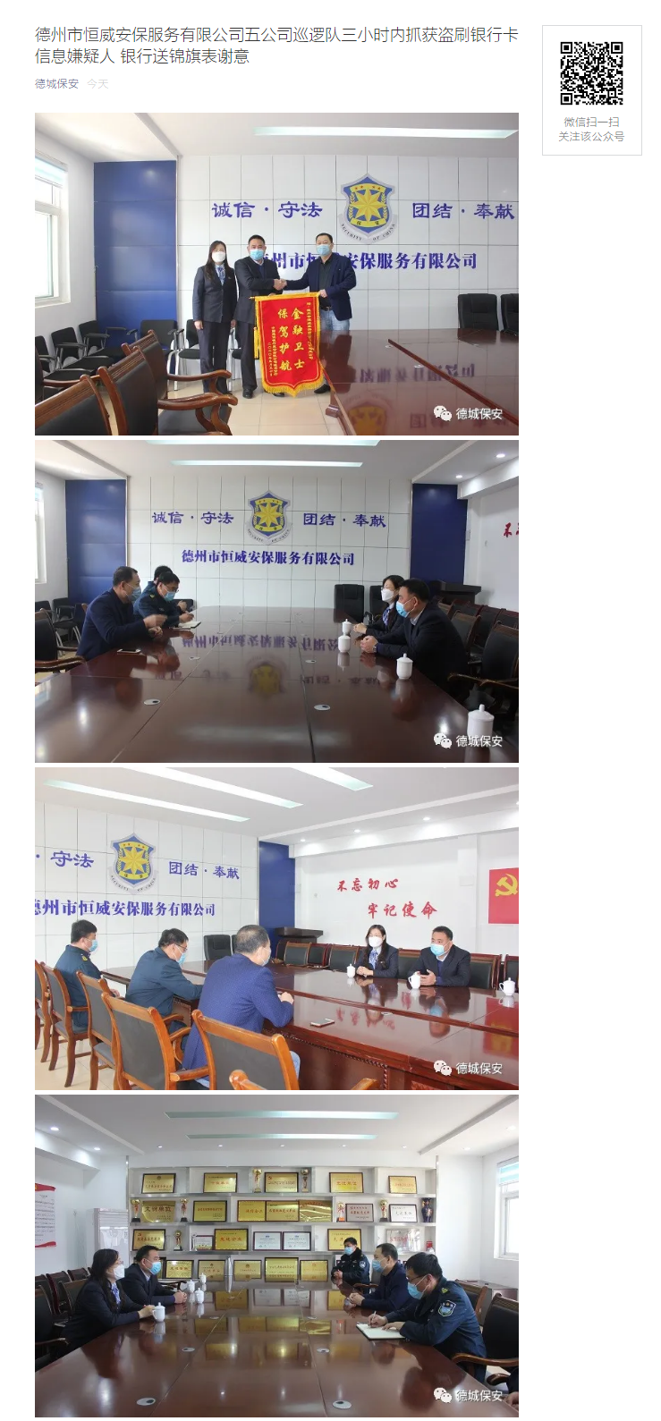 近日,恒威安保服務(wù)有限公司巡邏隊在巡邏時發(fā)現(xiàn)一男子在某銀行自助網(wǎng)點,安裝了銀行讀卡器和攝相頭,欲盜取銀行卡信息進行違法盜取現(xiàn)金。恒威安保公司五公司接到通知,五公司領(lǐng)導(dǎo)高印東、尹紀昌好時間趕到現(xiàn)場,迅速組織精干隊員,采取有力措施,僅三小時內(nèi)便將涉嫌盜刷銀行卡信息的犯罪嫌疑人抓獲歸案。目前犯罪嫌疑人已被派出所刑事拘留。 為表達謝意,4月3日上午,銀行相關(guān)領(lǐng)導(dǎo)攜帶錦旗專程來到恒威安保公司,送上一幅書寫著“金融衛(wèi)士,保駕護航”的錦旗向抓獲犯罪嫌疑人安保人員致敬。公司總經(jīng)理王新衛(wèi)接待了他們,并與他們交流了公司的安保情況,銀行相關(guān)領(lǐng)導(dǎo)對公司的管理規(guī)范和安保人員的素質(zhì)給予了較高的評價。