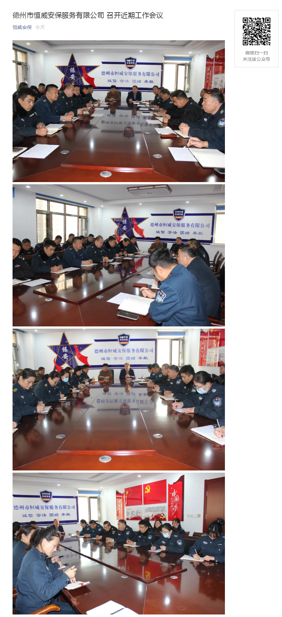 11月16日,德州市恒威安保服務有限公司召開會議,對近期工作進行安排部署。會議由公司總經理王新衛主持,中層以上管理人員參加。
